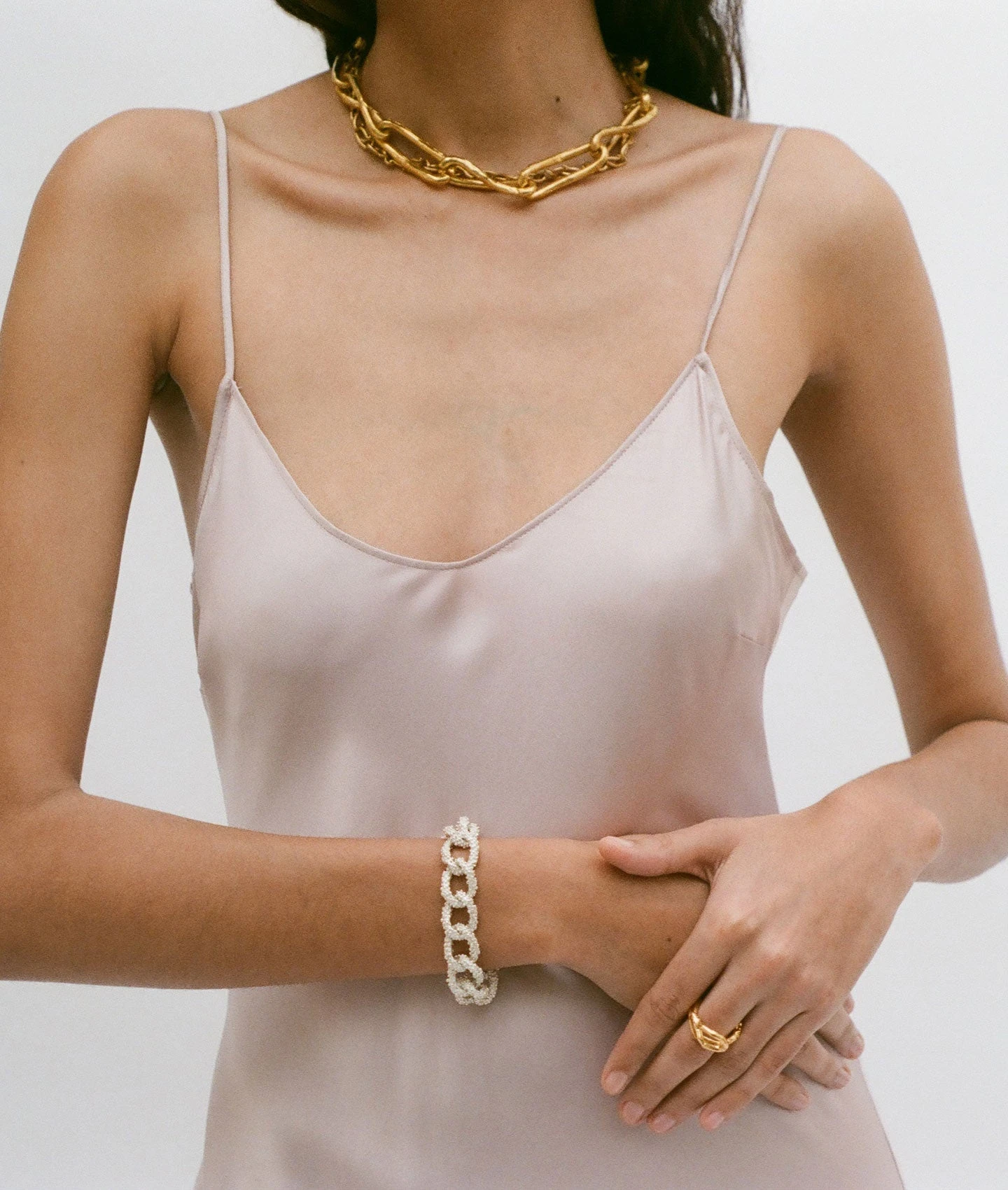 The Aphrodite Bracelet is handcrafted from solid sterling silver with a 24kt gold plated silver Albert Clasp in Hatton Garden, London.