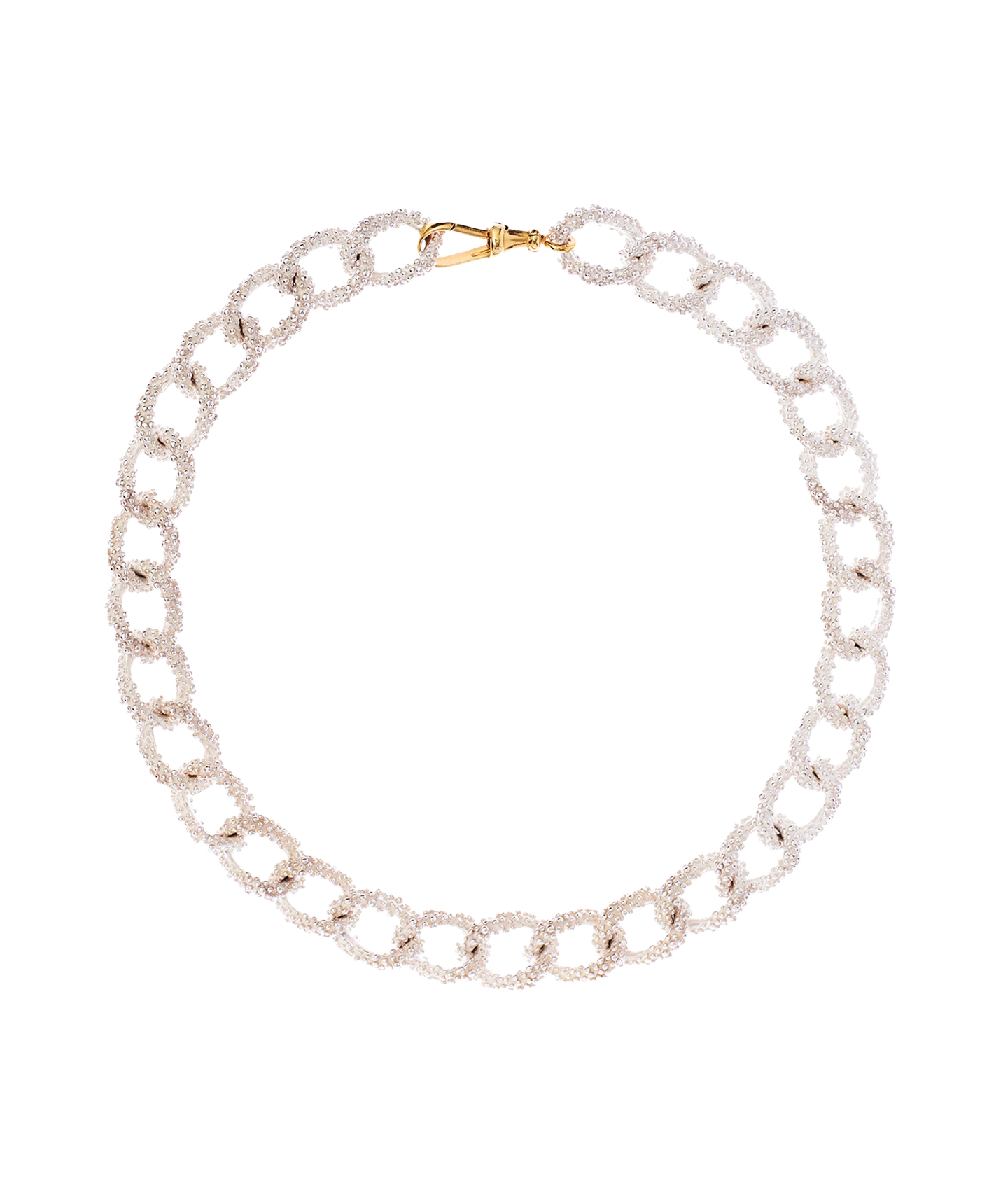 The Aphrodite Choker is handcrafted in Hatton Garden, London. The links are solid sterling silver with a 24kt gold plated silver Albert Clasp. It is designed to sit at 41cm, on the collarbone.