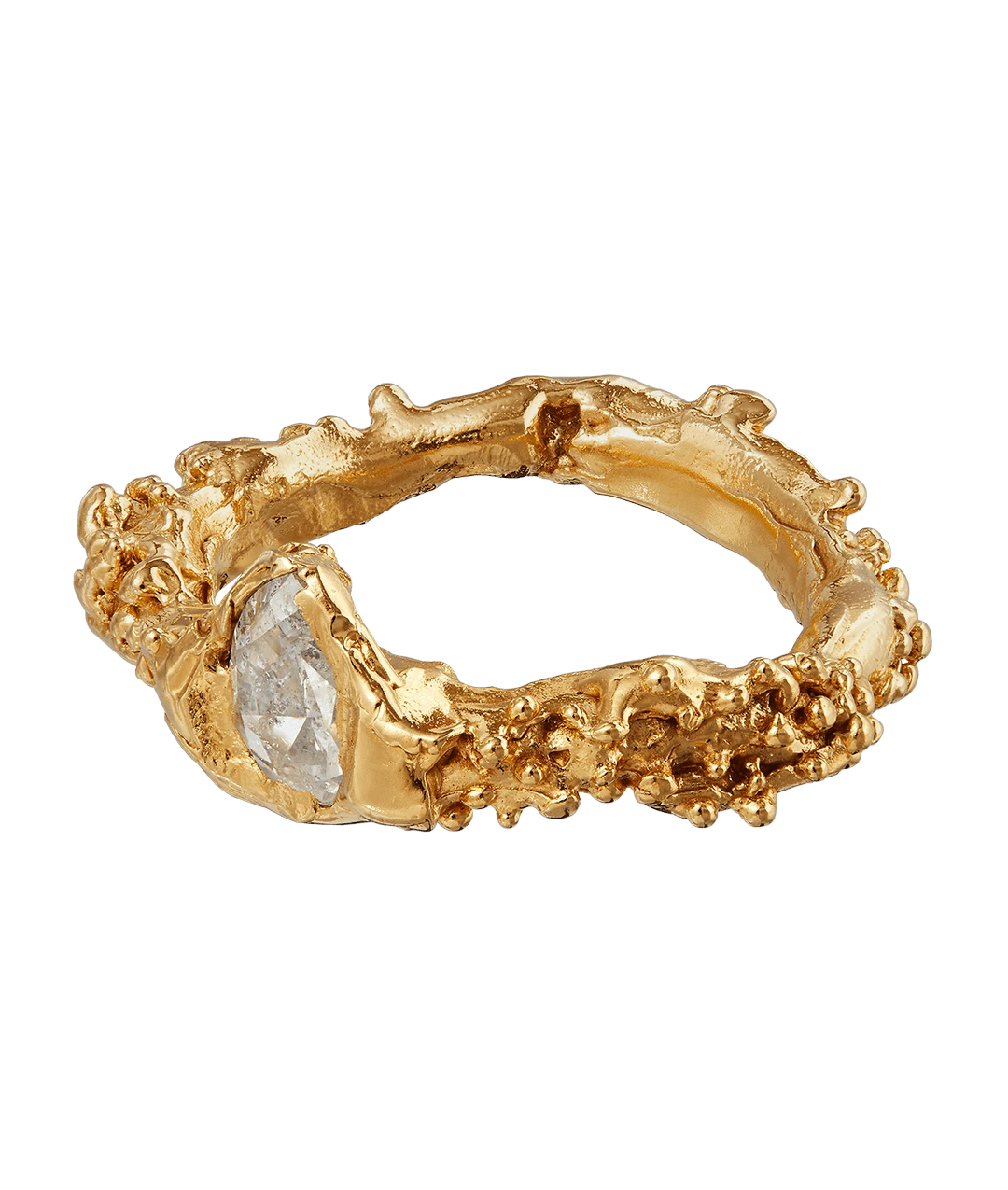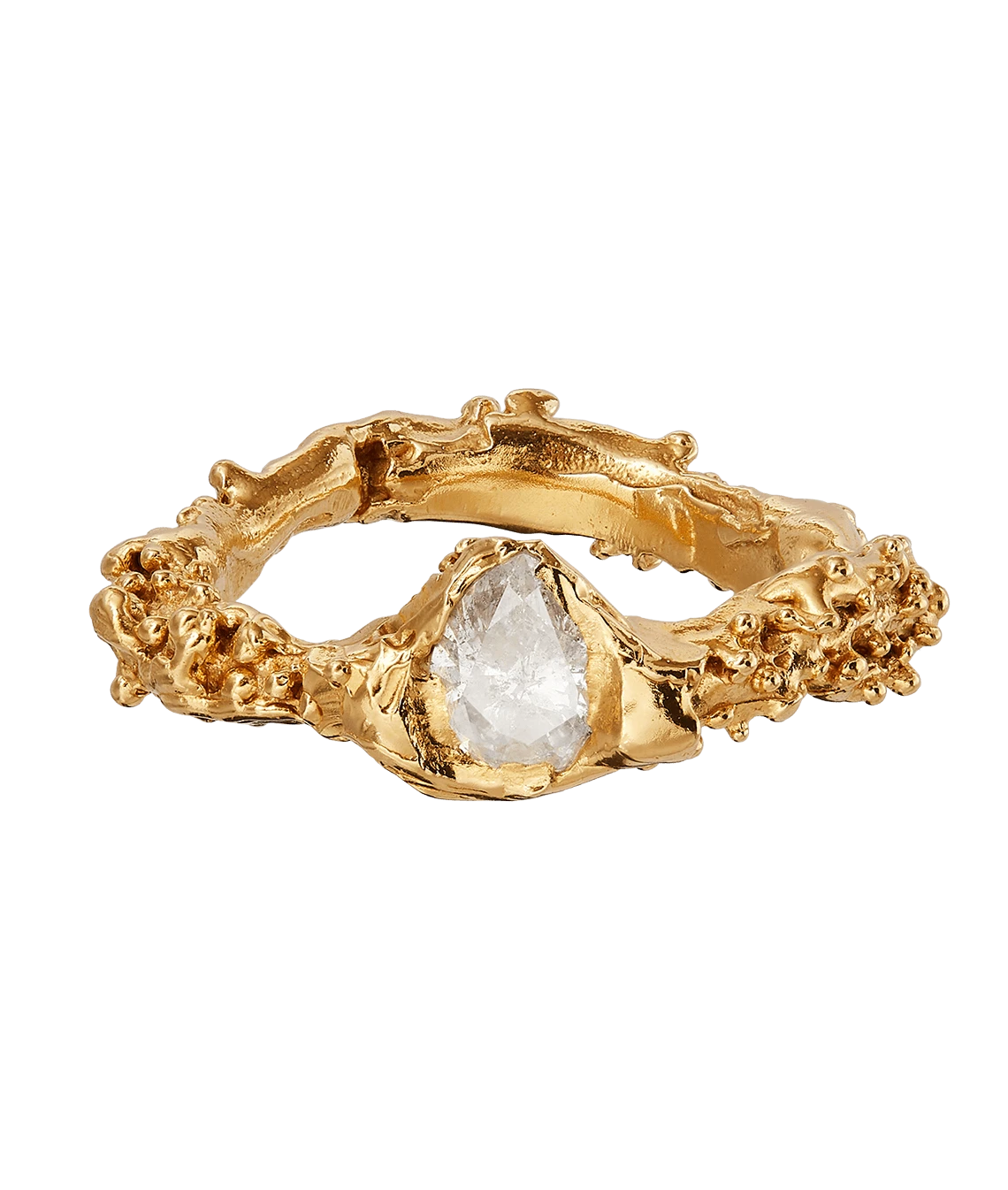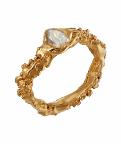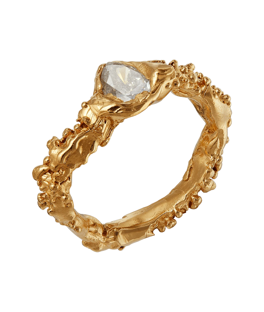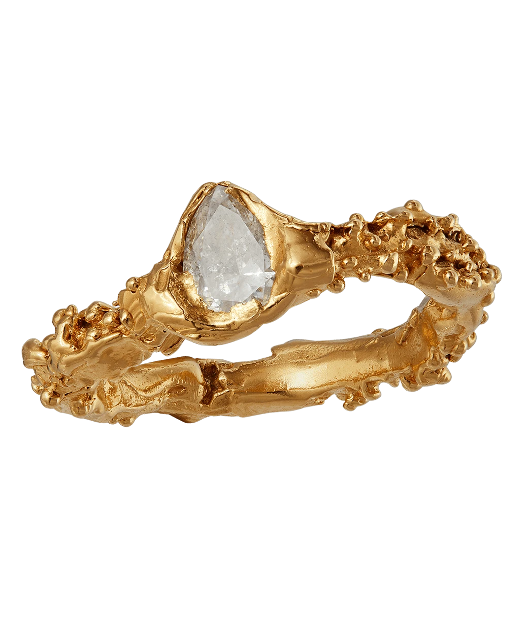 The Bewitching North Star Diamond Ring is a one-of-a-kind creation. It is hand-crafted locally in the UK from 9kt solid gold and plated in 24kt gold, set with a pear-shaped salt and pepper diamond.