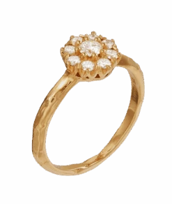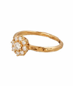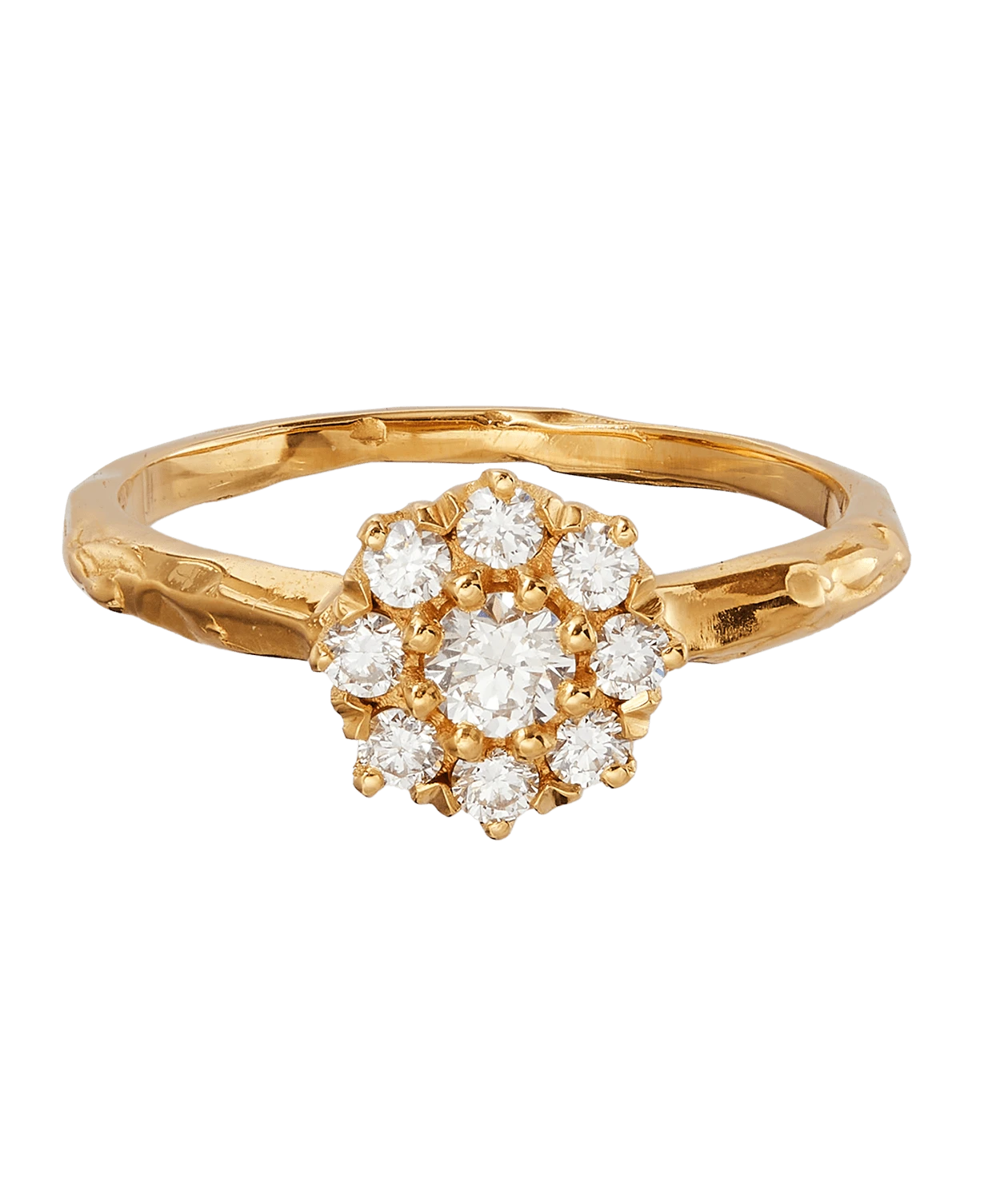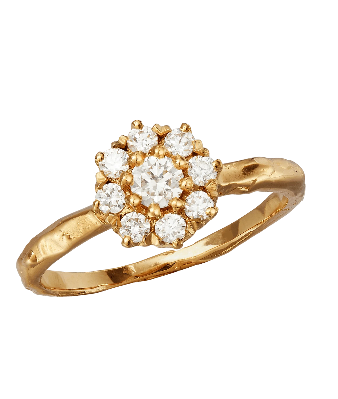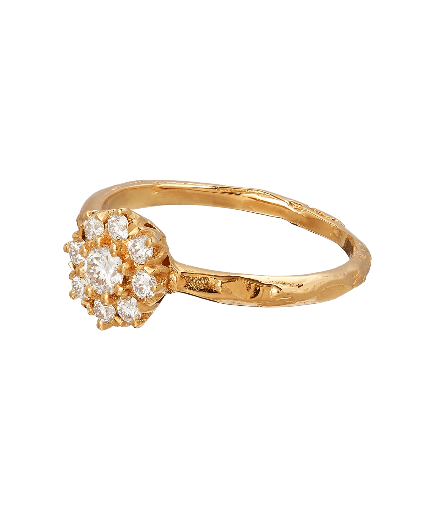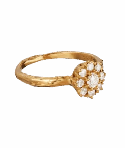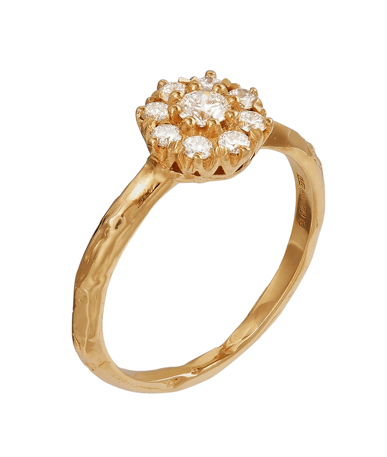 The Celestial History Diamond Ring is a one-of-a-kind creation, hand-crafted locally in the UK from 9kt solid gold and plated in 24kt gold, set with round brilliant cut diamonds.