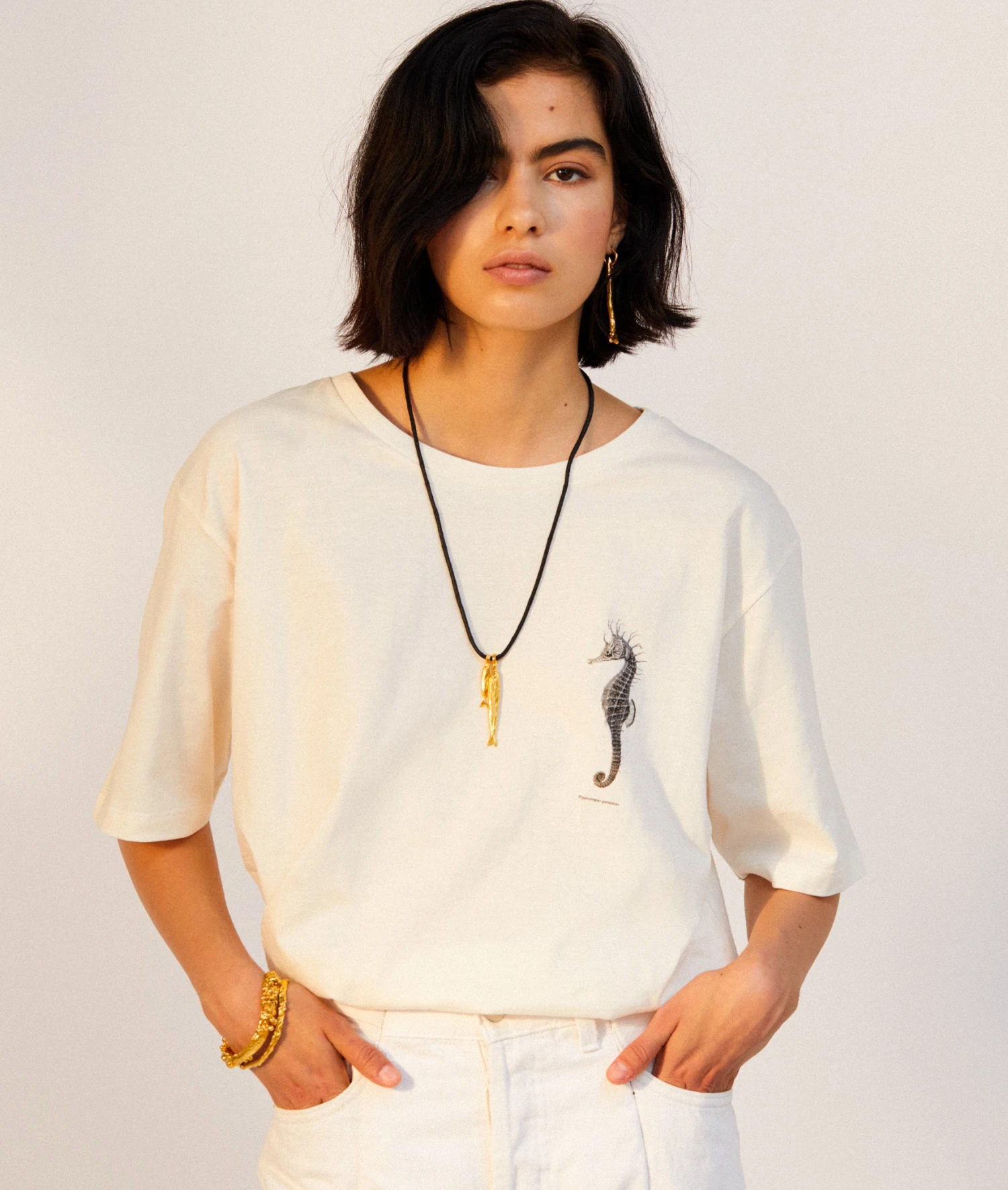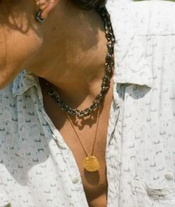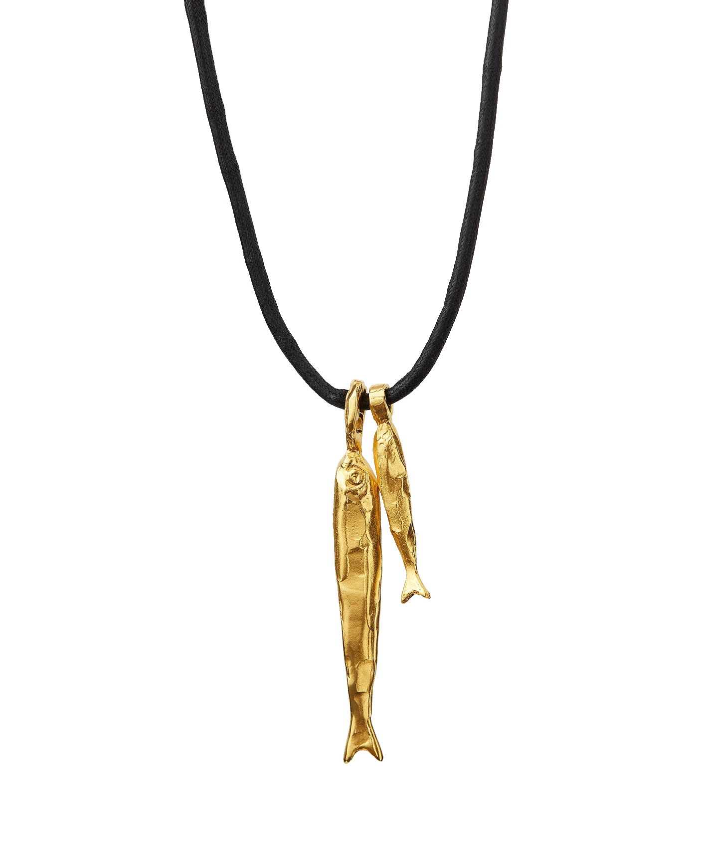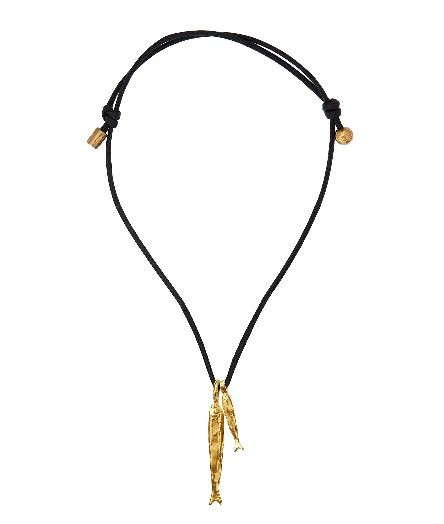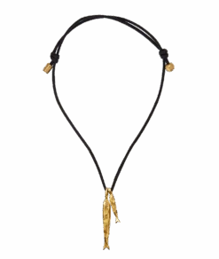 The Gone Fishing Necklace celebrates the magic of seaside adventures and the summer souvenir. A pair of molten gold fish are suspended on black Japanese cord; cast in recycled bronze and plated in Alighieri’s signature 24kt gold-plating in the UK. Carry it to bring you all good things on your adventures.Â