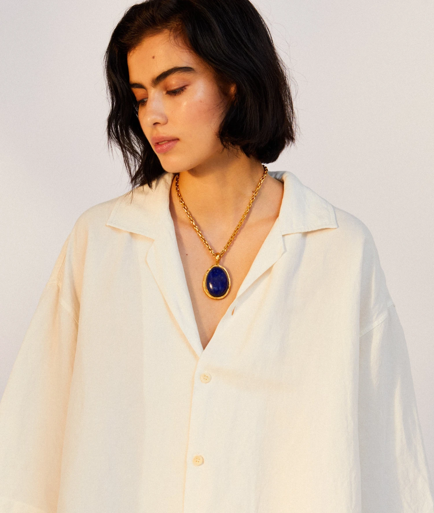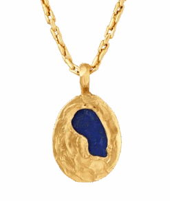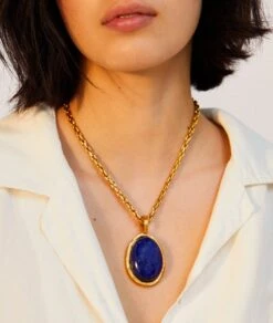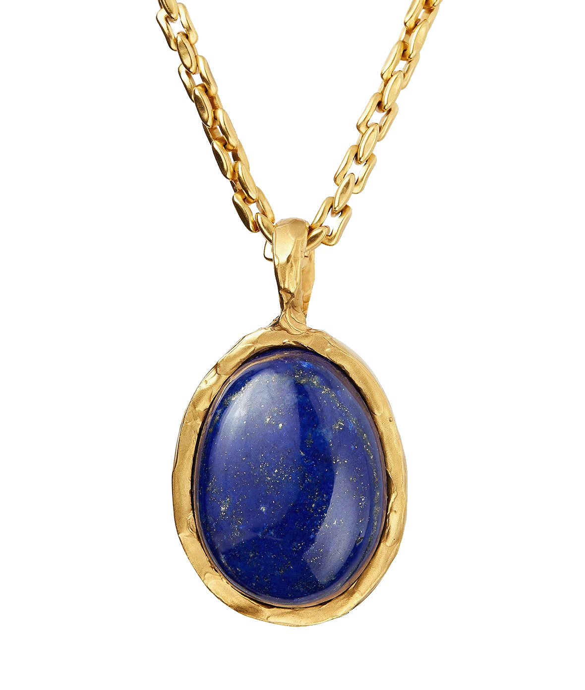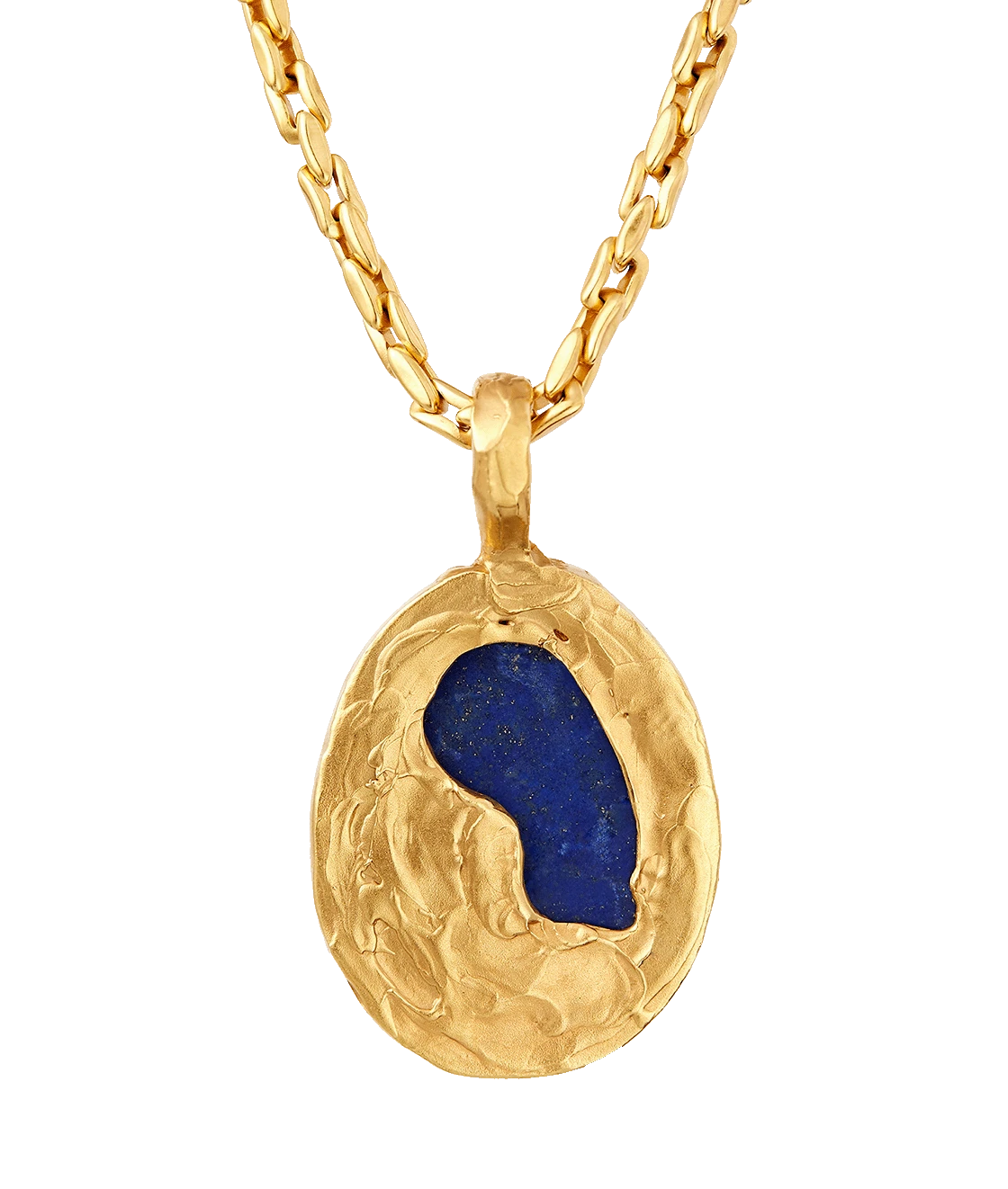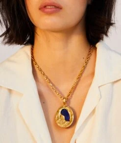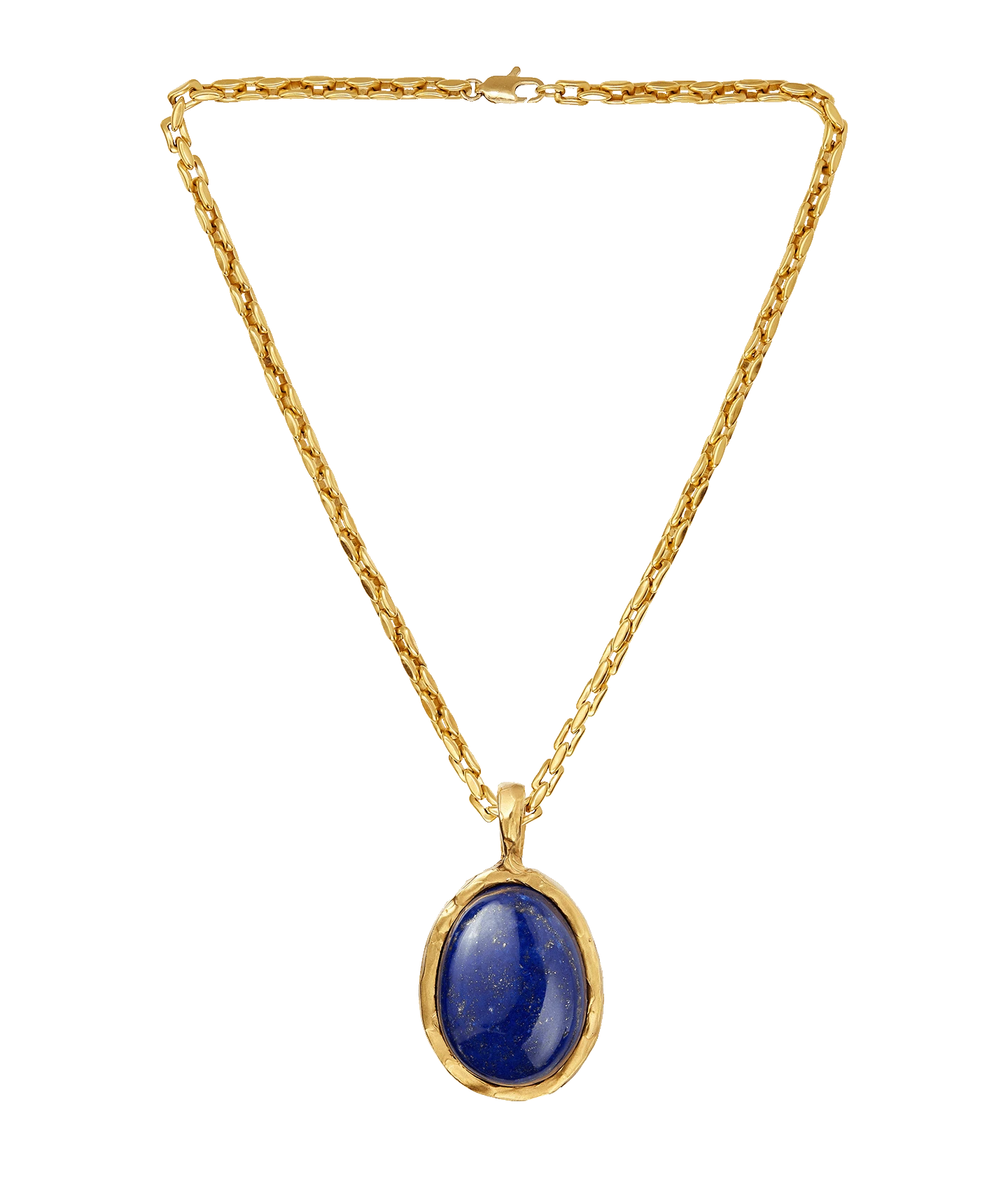 The Sablier of the Horizon Choker celebrates the magic of summer adventures and the endless blue horizon. A statement domed lapis lazuli is set in Alighieri’s molten texture; cast in recycled bronze and plated in our signature 24kt gold-plating, in the UK. Hanging on chunky vintage-inspired chain, carry this powerful stone to protect you on all your adventures.Â
