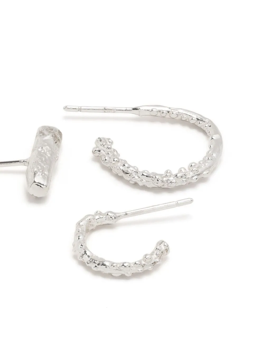 set-of-three Starry Night earrings from Alighieri featuring sterling silver, polished finish, engraved detail, post-back fastening, half hoop design, stud design, for pierced ears, Large Hoop: Width (0.3cm), Small Hoop: Width (0.2cm) and Long Stud: Width (0.2cm). These items come as a non-matching set.. Conscious: We’ve partnered with Good On You – an ethical agency that rates how sustainably brands perform. This item comes from a brand that performs well in relation to their impact on the planet..