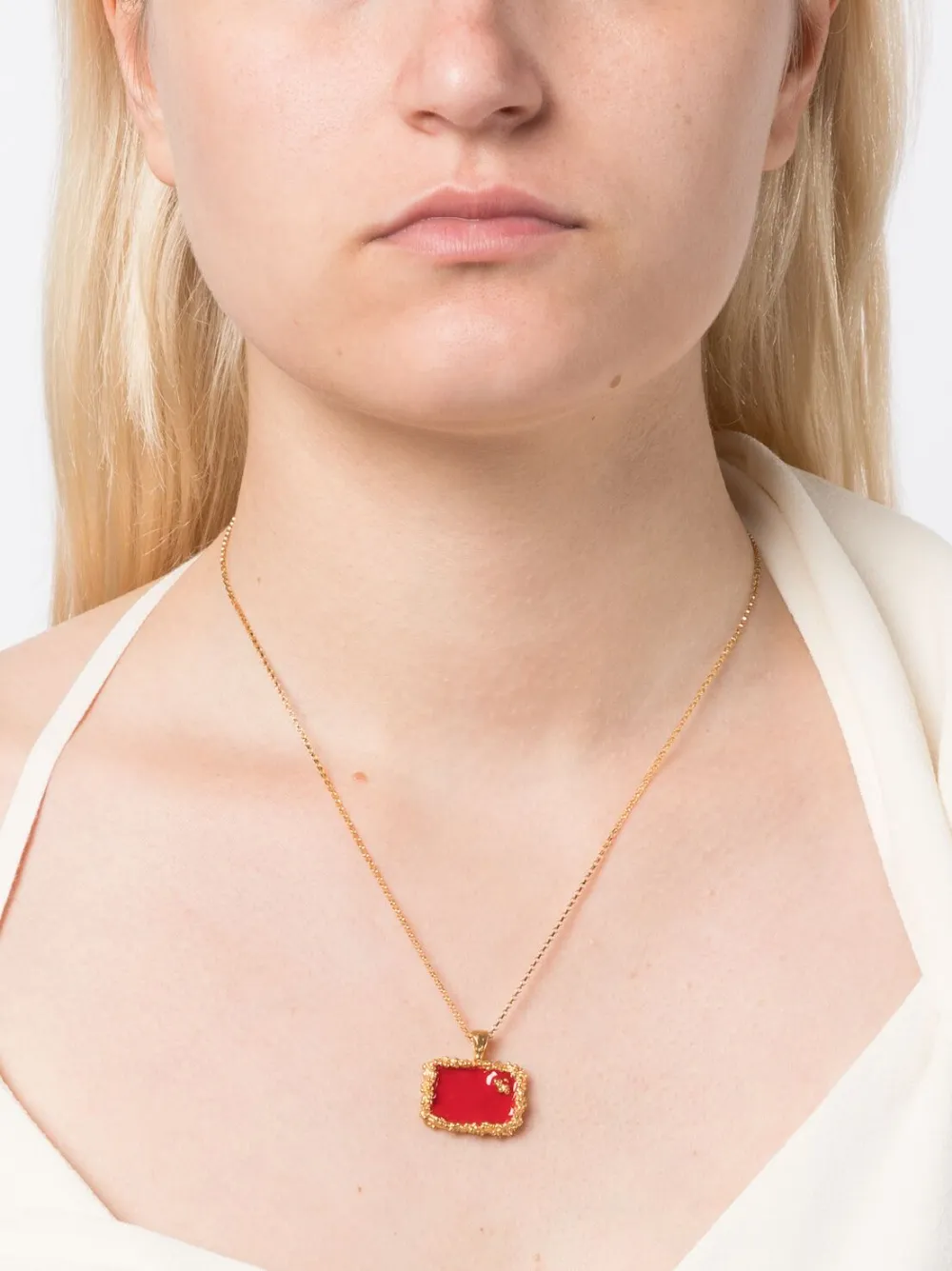 The Sun-Faded Fresco necklace is hand-crafted from 24kt gold-plated bronze in the UK. It’s finished with a rectangle pendant, with the signature rocky texture around a pool of crimson enamel.
