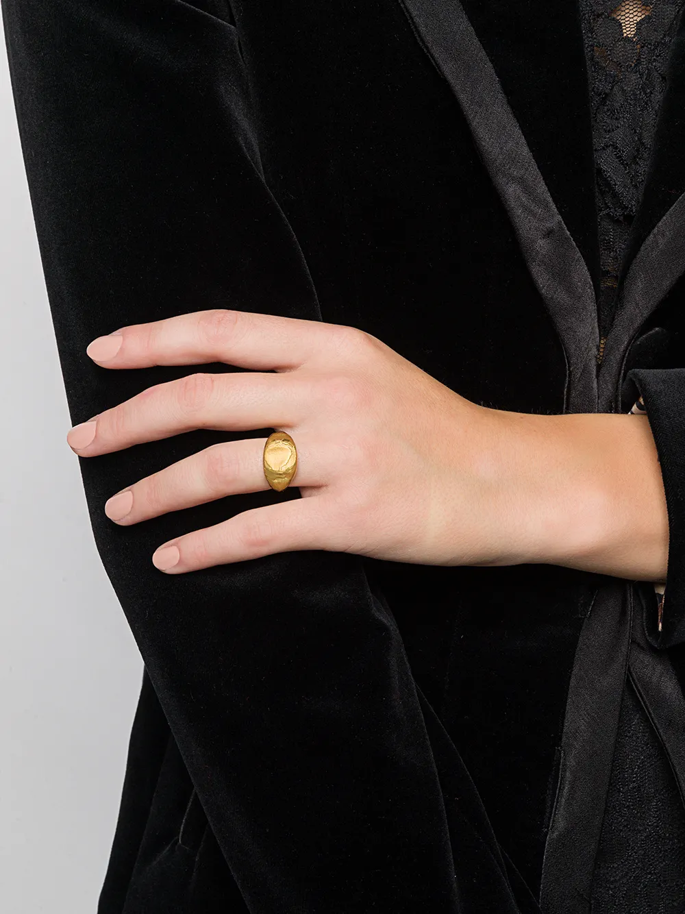 The constant tension between light and dark, real and imaginary, is the context for Alighieri’s Lost Dreamer Collection, which embraces the magical ambiguity of sometimes not quite knowing which is which. Sculpted in 24kt gold plated bronze The False Promises ring from Alighieri features a signet style. POSITIVELY CONSCIOUS: ALIGHIERI scores 4 out 5 by independent ethical brand rating agency Good On You. It uses eco-friendly and recycled materials, manufactures locally to reduce its carbon footprint, traces most of its supply chain and visits suppliers regularly.