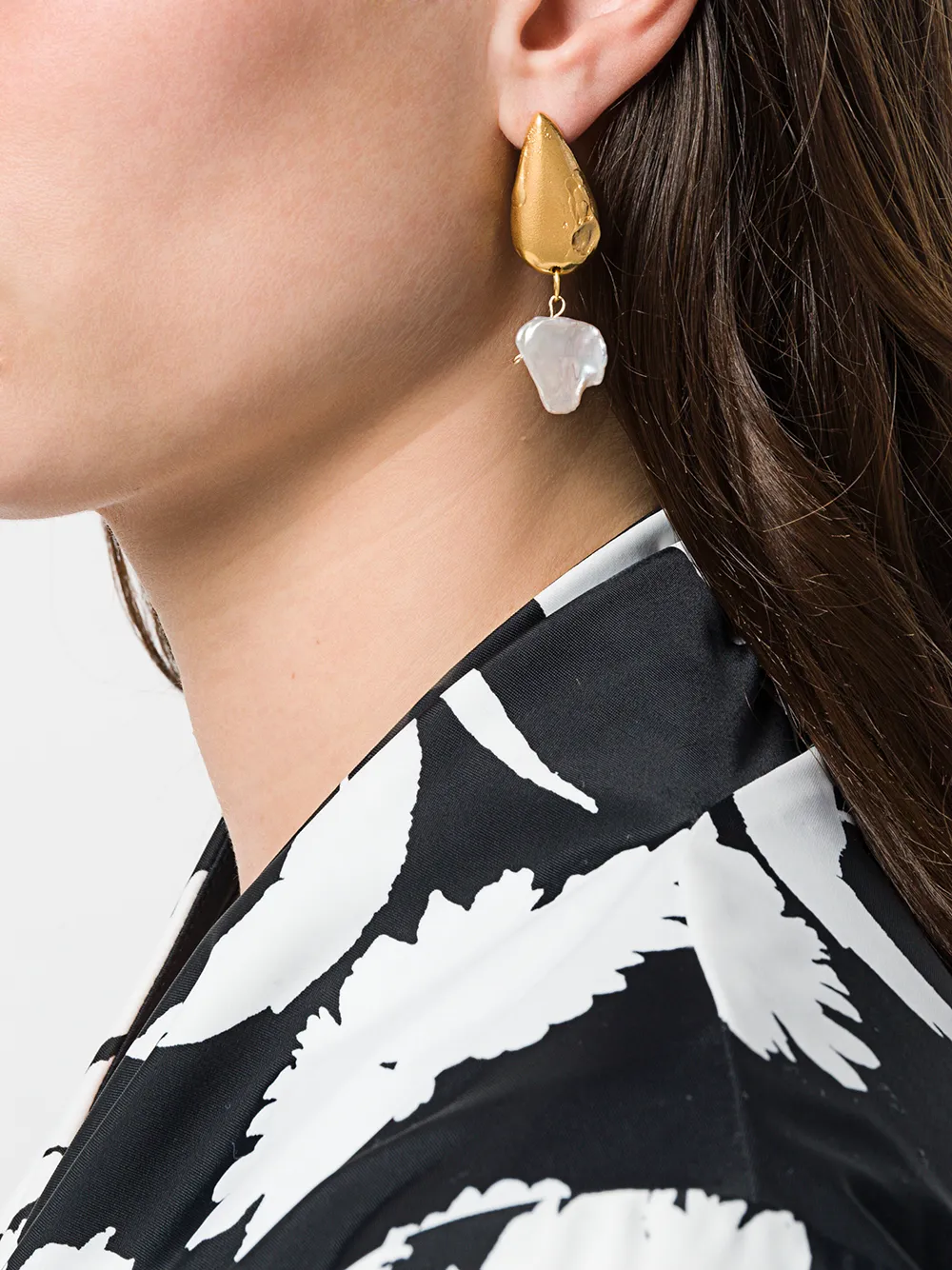 Alighieri is a collection of jewellery inspired by Dante Alighieri’s ‘Divine Comedy’. To date, Alighieri collections have always been created from the point of view of Dante; the lost poet in the selva oscura, unsure and slightly afraid. The Land of the Lawless shifts the perspective to that of the souls in hell: those who have no regard for order or rule. From the lustful to the heretics, the magicians to the thieves, this collection explores the childish, and often joyful nature of doing the wrong thing; of building our own world wherever we go. Sculpted in 24kt gold plated bronze, The Fear and The Desire earrings from Alighieri features a freshwater pearl, water drop shape and post back closure. These earrings come as a pair. POSITIVELY CONSCIOUS: ALIGHIERI scores 4 out 5 by independent ethical brand rating agency Good On You. It uses eco-friendly and recycled materials, manufactures locally to reduce its carbon footprint, traces most of its supply chain and visits suppliers regularly.