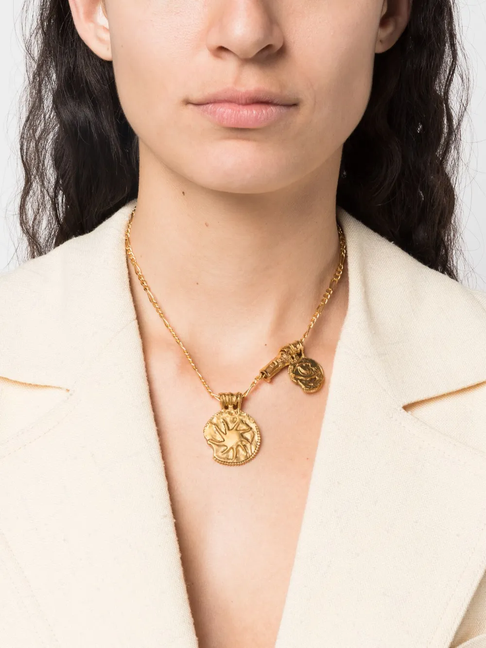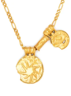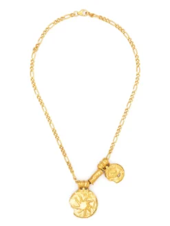 Alighieri’s The Return to Innocence necklace is inspired by founder Rosh Mahtani’s early childhood days in Africa. Handcrafted from 24kt gold-plated bronze, it’s strung with sun and eye-engraved pendants.