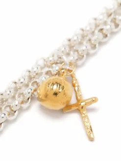 Alighieri’s The Spellbinding Orb bracelet has been handcrafted from strands of recycled sterling silver chain links in London’s famed Hatton Garden jewellery district. The hammered effect of the gold-plated cross and sphere charms give the piece an antique feel.