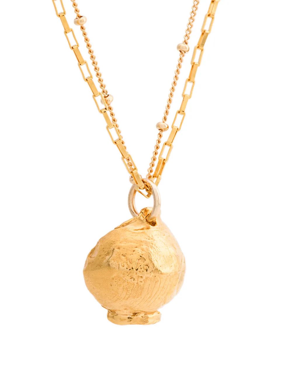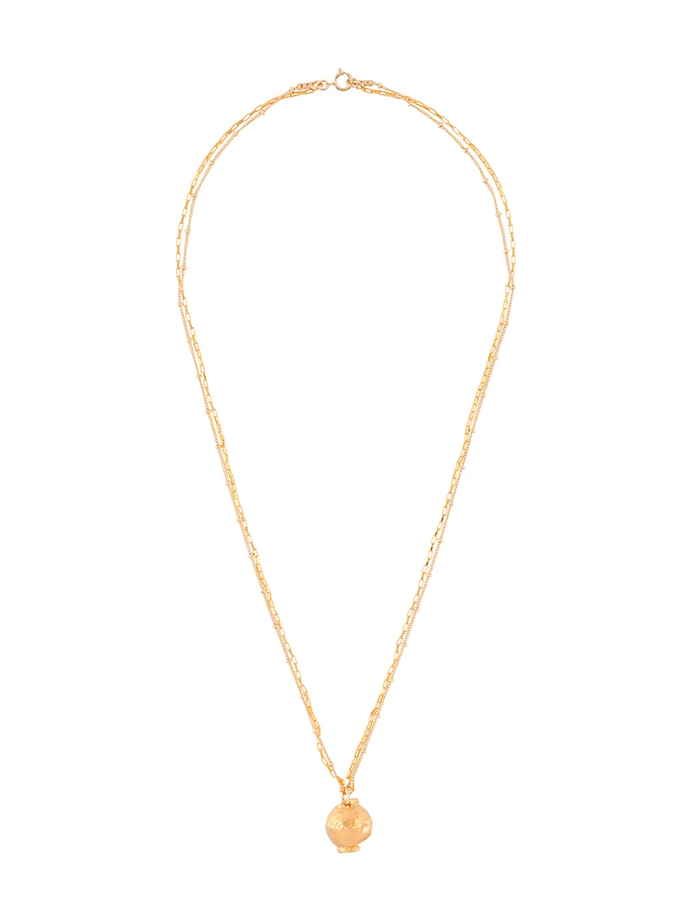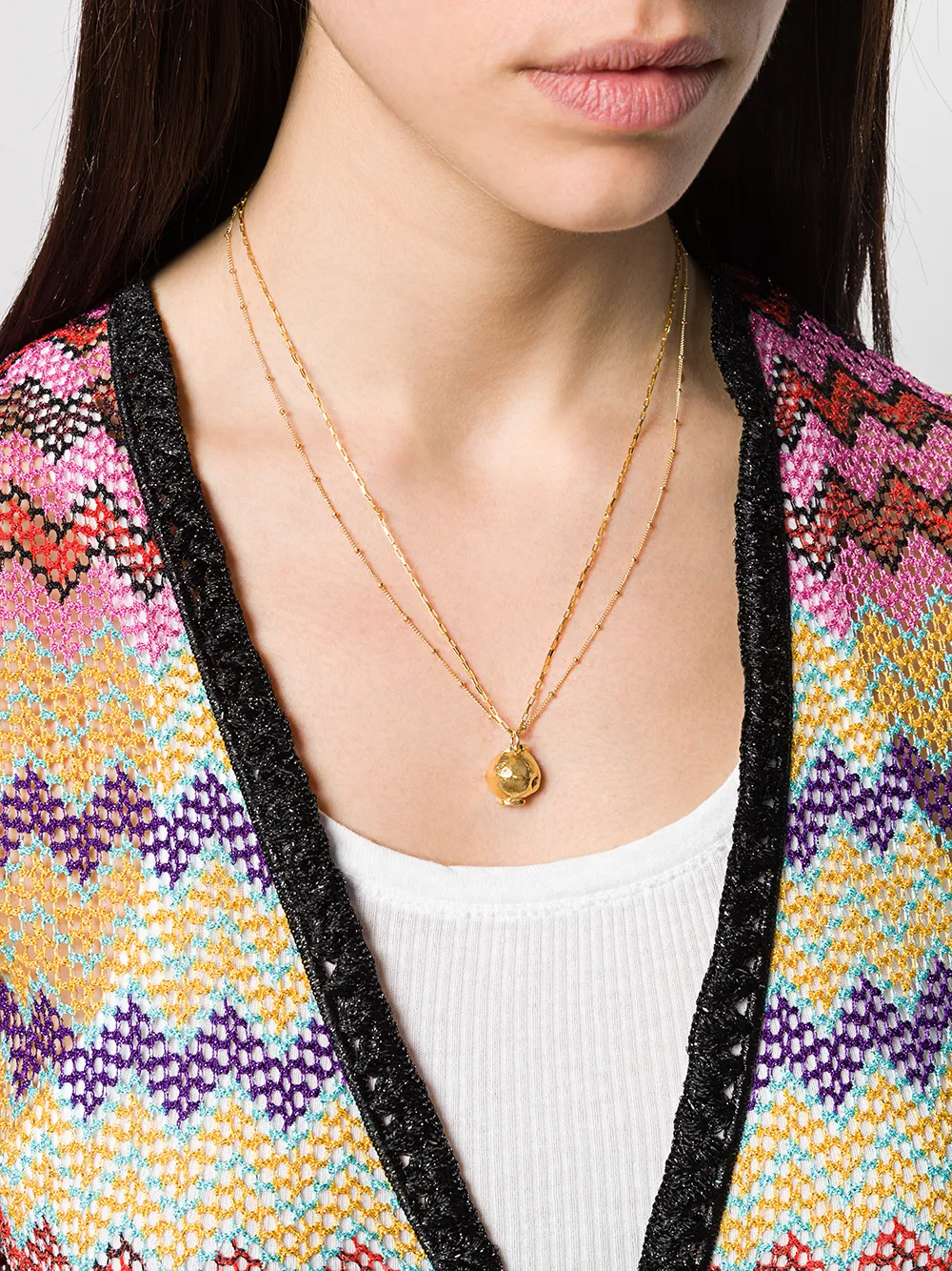 From ‘The Museum of Memories’ collection, this gold plated brass The Unreasonable Imagination necklace from Alighieri features a spring-ring fastening, an abstract shape pendant and a double chain. POSITIVELY CONSCIOUS: ALIGHIERI scores 4 out 5 by independent ethical brand rating agency Good On You. It uses eco-friendly and recycled materials, manufactures locally to reduce its carbon footprint, traces most of its supply chain and visits suppliers regularly.